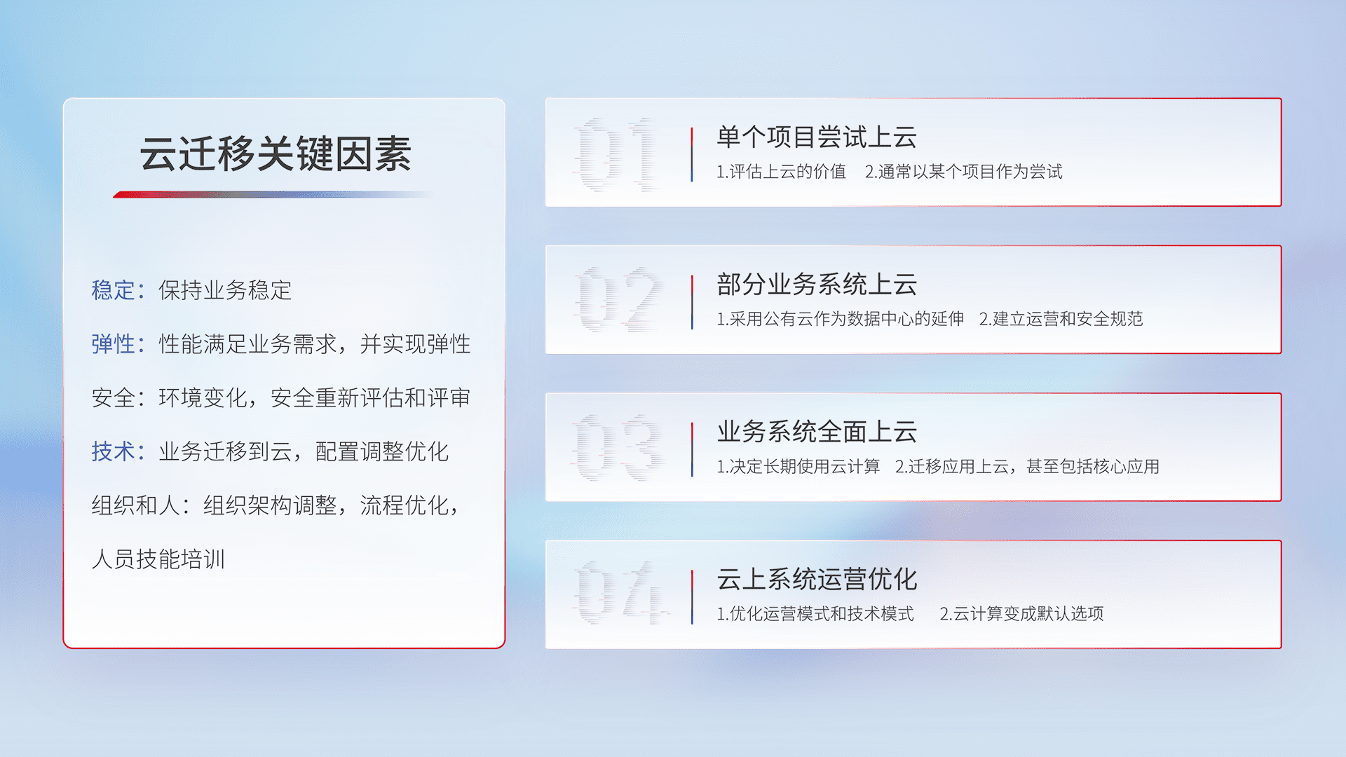 结合实际业务,,从规划设计、、、云平台选型、、、云原生改造、、、数据迁移、、、、集成交付,,,迁移全过程为客户识别最佳上云路径,,做好风险识别管理,,,设计网络架构、、、身份权限、、安全审计合规、、操作审计、、、日志审计、、、、监控告警策略、、、多站点容灾设计等,,,对云上基础设施进行整体规划,,,提升IT治理水平,,,以满足弹性、、、高可用、、、高性能的需求。。。。